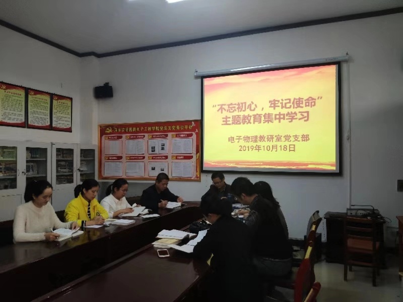 10月18日,565net必赢客户端电子物理教研室党支部全体党员在2216教室开展“不忘初心,牢记使命”主题教育活动,活动由党支部书记李伯勋主持。此次活动中,大家集体学习了习近平总书记对江西工作重要讲话金句,学习了习近平总书记在“不忘初心,牢记使命”主题教育会议上的讲话内容,深刻领会了此次讲话的目标要求和精神内涵。