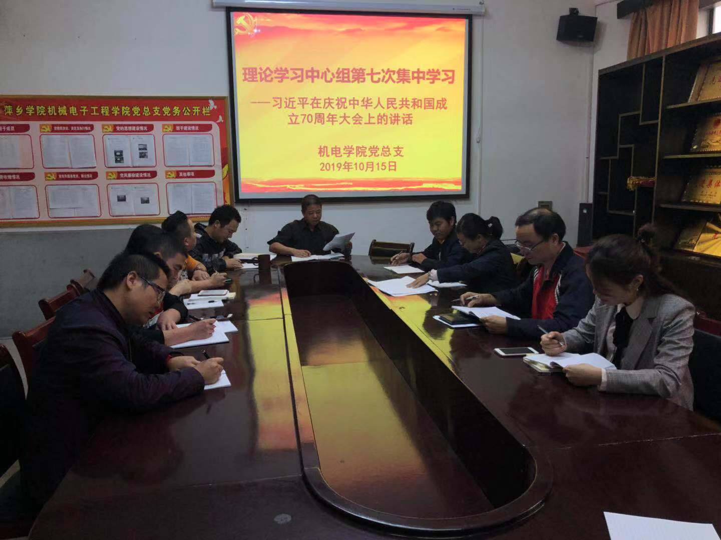 2019年10月15日,机械电子工程学院理论学习中心组召开专题学习会议,学习习近平总书记在庆祝中华人民共和国成立70周年大会上的讲话精神。学院党总支书记王斌主持会议,学院理论中心组成员参加。