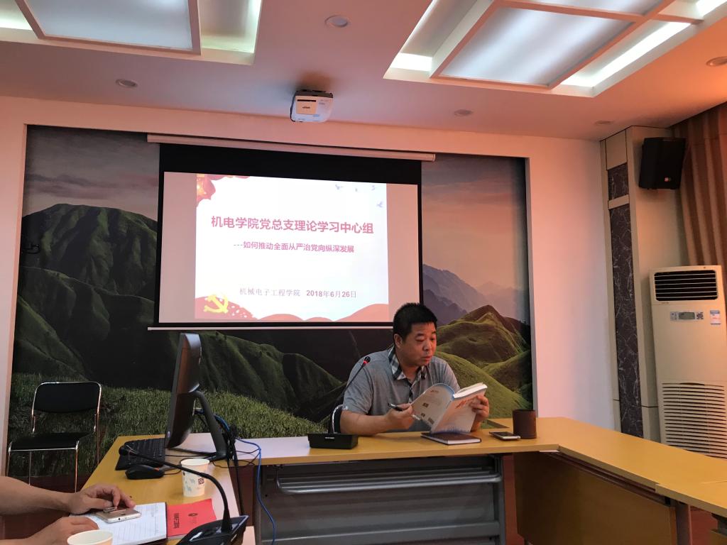 为深入扎实推进“两学一做”学习教育制度化、常态化,深刻领会习近平总书记重要讲话意涵,强化工作作风和纪律意识,将学校各项决策部署落到实处,2018年6月26日,机电学院党总支中心组召开了“如何推动全面从严治党向纵深发展”理论学习会。会议由王斌主持。