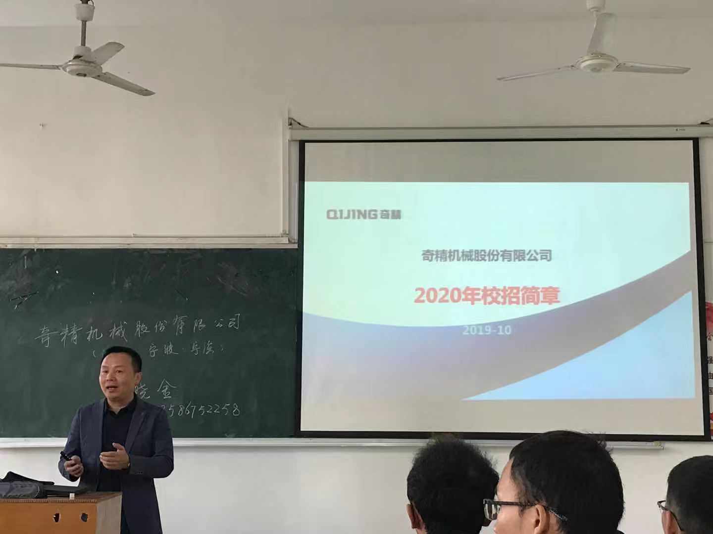 奇精机械股份有限公司是565net必赢客户端的校企合作单位,会上,学校就业处温主任表示,欢迎奇精机械股份有限公司到学校招聘人才,感谢用人单位多年来对学生实习和就业工作的大力支持,并介绍了奇精机械股份有限公司的基本情况。随后,企业负责人邹总介绍了公司的发展历史、业务范围、招聘岗位和要求、福利待遇等,并与同学们分享了自己在单位和行业的工作体会与感悟,鼓励大家敢于尝试积极应聘。现场有许多学生投递了简历,邹总与参加宣讲会的2020届毕业生进行了面试。