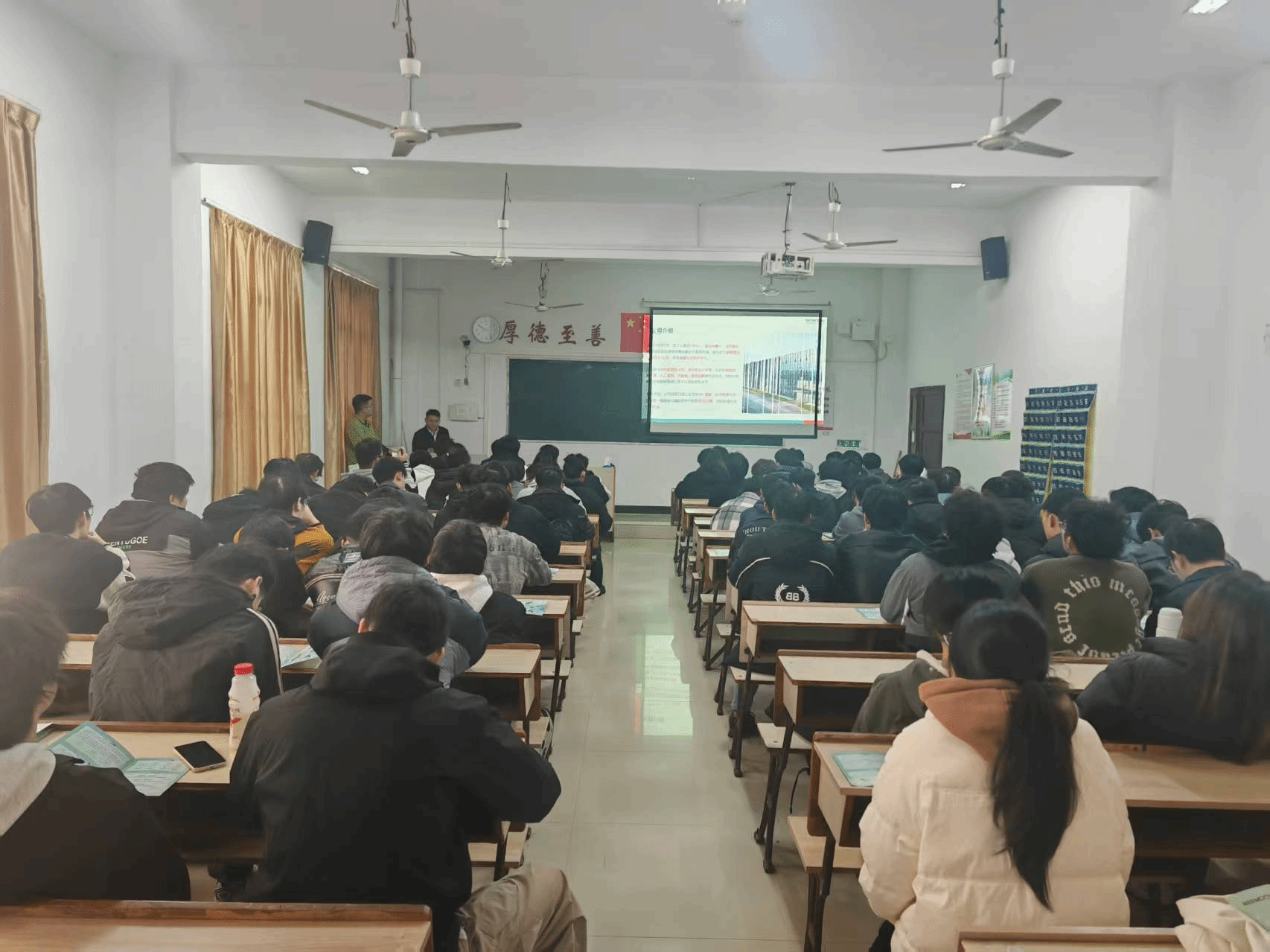 宣讲会上,企业代表以“科技赋能农业,创新引领未来”为主题,详细介绍了公司的发展历程、核心业务及人才需求。作为国内智能分选领域的领军企业,绿萌科技重点展示了其在果蔬自动化处理设备研发上的技术优势,并结合岗位实际,强调了对机械设计、电子控制、自动化应用等专业人才的需求。值得一提的是,2014级优秀校友陈奇栋作为企业技术骨干重返母校,以“学长”身份分享职业成长经历,从基层工程师到项目负责人的蜕变之路,引发了在场学生的强烈共鸣。他鼓励学弟学妹们“夯实专业基础,勇于实践创新”,并耐心解答了关于职业发展、技能提升等问题。