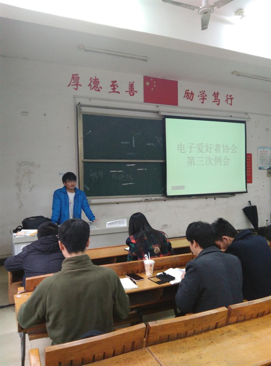 2015年12月2日中午12:30,电子爱好者协会在英华楼3106正式召开了本学期第三次例会。参会人员有协会会长、副会长、各部门部长、14级成员代表以及15级新成员,尽管下着小雨,大家依然遵时到达。