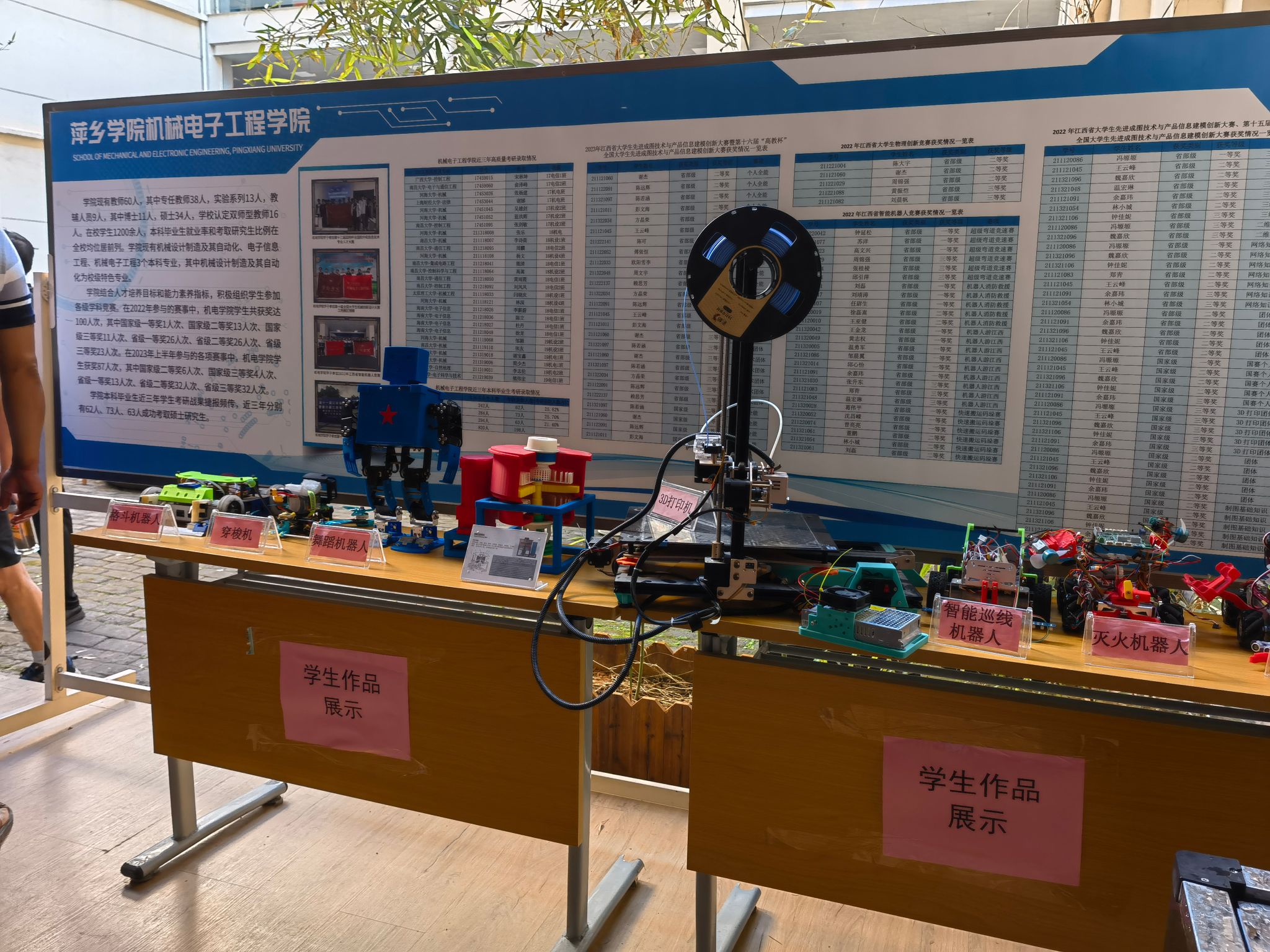 机械电子工程学院迎新现场有智能线巡机器人、3D打印机等学生创作的竞赛模型,科创氛围浓厚。