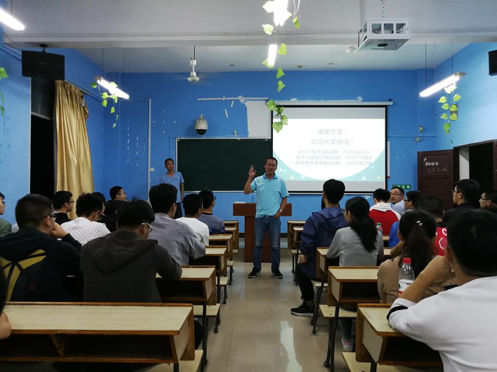 最后,汪靖、孙建成耐心细致的解答了同学们的疑难问题。本次宣讲会有针对性地解决了同学们对考研问题的不解,同学们都精神饱满,积极提问,整个现场热情洋溢。宣讲会在同学们热烈的掌声中圆满结束。