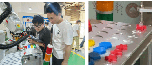 比赛选手们需根据指定规则,在规定时间内完成机器人编程调试、触摸屏编程调试、PLC编程控制,在规定内完成对红色五角星的搬运,根据各组搬运效果展示对其进行评分。