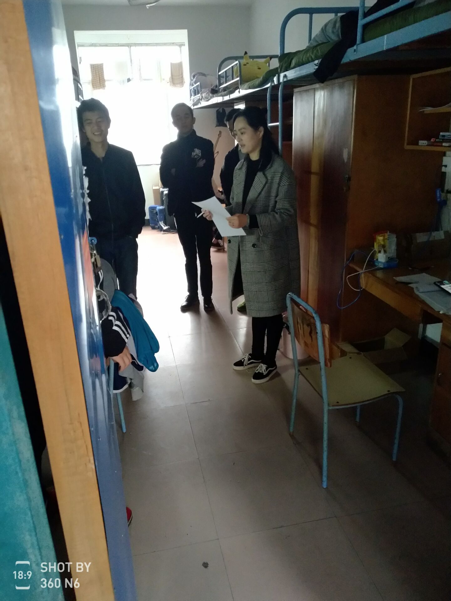 进入寝室后,领导、老师们亲切的和寝室里的同学打招呼,向寝室里的同学询问有腹泻症状的同学身体状况,并为有不舒服的同学提出:去学校医务处领取药物,多喝开水,注意保暖,寝室要按时用消毒水消毒等等切实建议。走访了多个宿舍,大部分宿舍地面卫生干净,东西摆放整齐有序,学院领导老师表示很是欣慰,同时也督促各寝室继续坚持每天消毒,杜绝安全隐患。