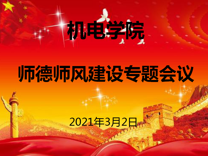 为深入贯彻落实中央关于高校师德建设的相关要求,加强新时代教师队伍建设,2021年3月2日下午,机电学院在会议室2200召开师德师风建设专题会议。学院全体教职工参加,会议由党总支书记王斌主持。