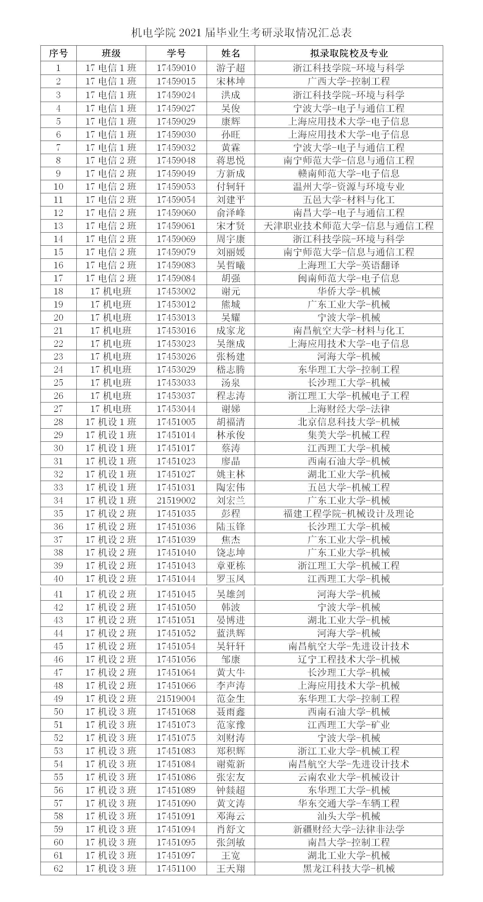 近期,随着全国各高校研究生拟录取结果的陆续公布,机电学院2021届毕业生考研战果捷报频传,现已有62名学生被录取为硕士研究生。今年的考研战果,不管是在考研录取的人数还是录取的质量上,都创造了近几年的最好成绩。据统计,必赢官网2021届本科毕业生共242人,其中有98人参加了研究生考试,有67人过了国家线,现已有62人被录取,录取的学校不乏有上海财经大学、广西大学、南昌大学、河海大学等211院校。