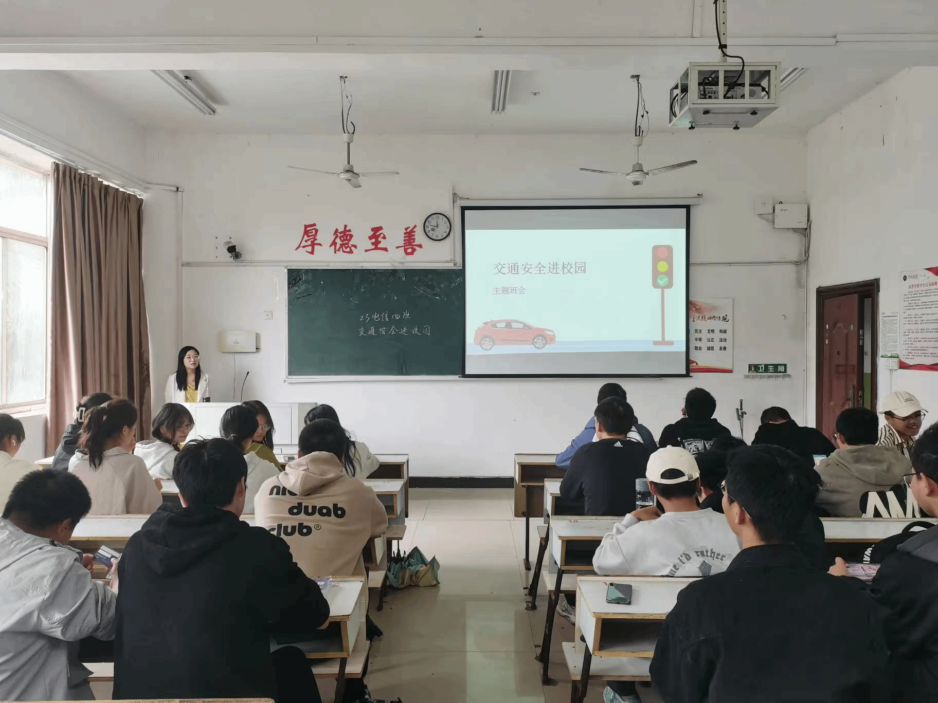 班会上,各班辅导员老师着重向学生介绍了交通安全知识的重要性,讲解了校园交通安全知识,并带领学生了解了校园交通安全有关规定和通知。班会过程中,分析了校园内交通事故发生的主要原因,事故处理的方式及如何进行有效预防。也提醒我们广大的在校大学生要自觉遵守交通法规,在人行道行走时应严格遵循置右原则,不得在道路上嬉戏、打闹,即使在没有人行道标志的地方行走也应先观察道路两边,避让过往车辆,确认安全后再通行。