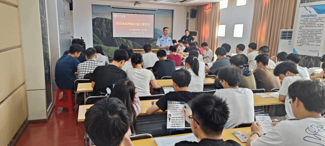 2024年6月13日,为有效遏制电信新型诈骗违法犯罪案件高发势头,切实提升广大师生的防范意识, 565net必赢客户端在各班级选派了44名学生骨干成员组建防诈骗宣讲团,并邀请安源公安分局东大派出所所长李丁胜在鼎新楼2200进行防诈骗专题培训班。