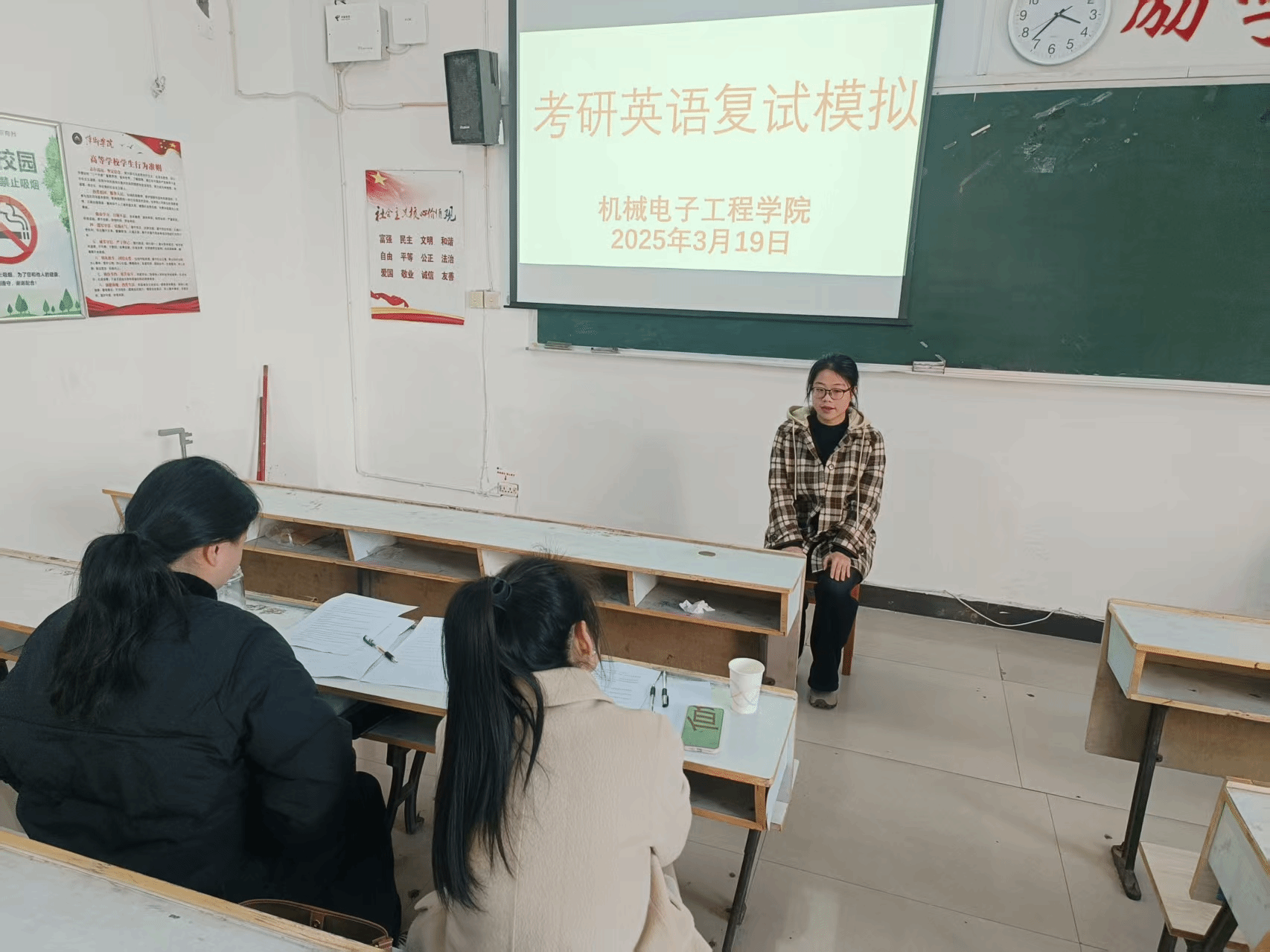 在正式的模拟面试开始前,钟倩老师凭借其丰富的英语教学经验和对研究生英语面试的深入研究,为同学们详细介绍了英语面试的整体流程和注意事项。从入场礼仪到与面试官的眼神交流、坐姿仪态等细节,都一一进行了生动的讲解和示范,让同学们深刻意识到良好的第一印象对于面试的重要性。