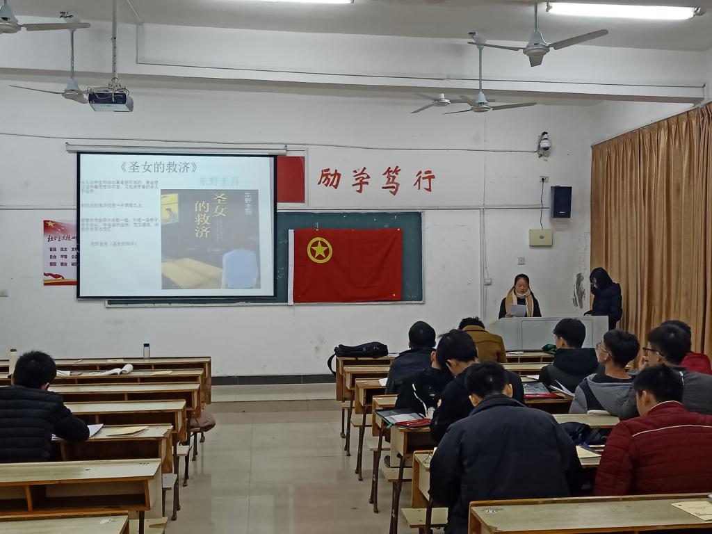 活动前期宋丽敏同学积极宣传,号召班上全体同学去参与此次活动,并上台分享自己所喜欢的书籍和自己看书的心得体会。活动开始,宋丽敏同学强调读书的重要性并请同学上台分享。陈露露同学踊跃上台,分享了自己的一本书——《圣女的救赎》,并大致介绍了这本书,分享了其中的一些精彩故事。而后袁利锋同学上台分享了一本杨绛先生的书——《我们仨》,并介绍了其中的优美语句。之后又有许多同学上台分享了自己所喜欢的书籍。活动过程中同学们认真地聆听,整个活动进行的非常顺利。最后宋丽敏同学宣布此次活动圆满结束。