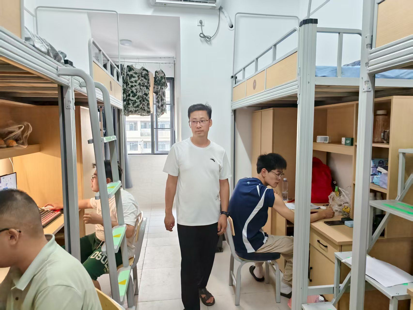 张老师询问了新生的生活习惯、军训情况、学习计划以及对学院生活的期待,同时对宿舍的卫生状况、安全设施以及学生的日常生活设施进行了仔细检查。他希望新生们能够珍惜大学生活,努力学习、积极进取,同时也要注重个人修养与品德的培养。他强调了宿舍安全与卫生的重要性,并鼓励学生们之间要互相帮助、互相学习、共同进步。还向新生强调了军训期间的各项问题,并鼓励新生坚持完成军训,实现自我突破。