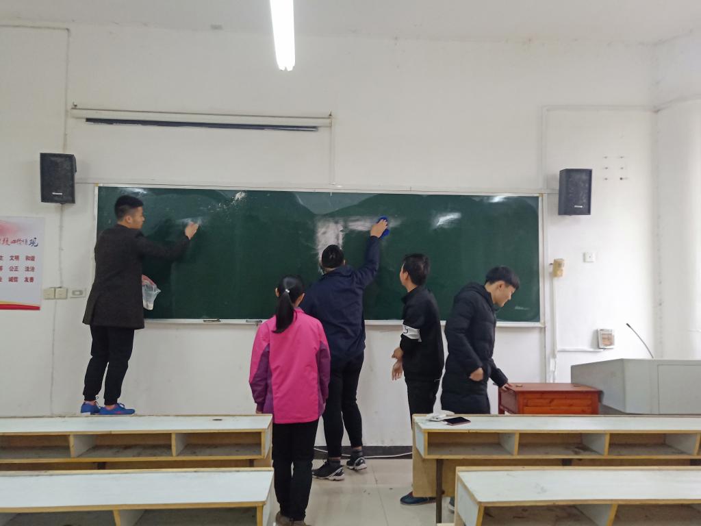 活动伊始,学生会执委冷强鑫组织各部门干事于2216开展活动安排,分发了各部门的任务并发放任务工具。随后,浩浩荡荡的清理“牛皮廯”及修理桌椅活动便开始了。黑板上的“牛皮廯”顽固不好清除,同学们便将面粉撒在了“牛皮廯”上,再用湿毛巾擦拭,“牛皮廯”便一点点的变少。清理的同时,修理桌椅小队于一个个教室进行慢慢检查,发现动摇的桌椅便拿起螺丝刀将其稳固。经过四十分钟,每一个教室清理“牛皮廯”及修理桌椅活动圆满结束。最后,大家于教学楼楼下进行合影留念。