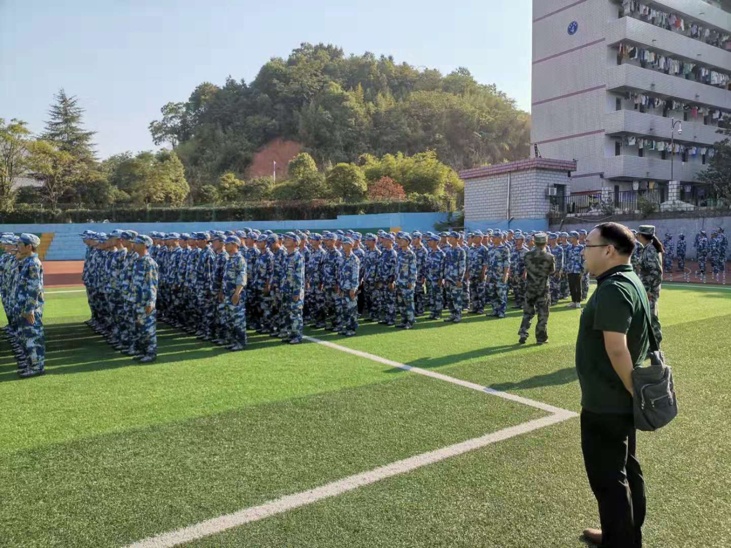 在军训现场,王书记每走到一个方阵前都会亲切地与同学们交谈,了解同学们的训练情况。王书记十分关心同学们在学校里的生活饮食起居情况,询问在训练中遇到的问题,向排长了解各连队的内务整理情况,并叮嘱同学们如果出现身体不适,要休息恢复后再进行训练,切不能逞强。王书记对同学们说:“经过两周的训练后,同学们取得了很大的进步,但还需要进一步提高步伐的整齐度和动作的柔韧性。”