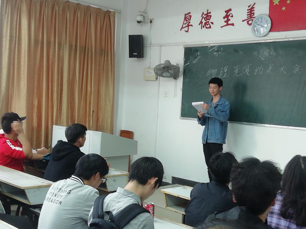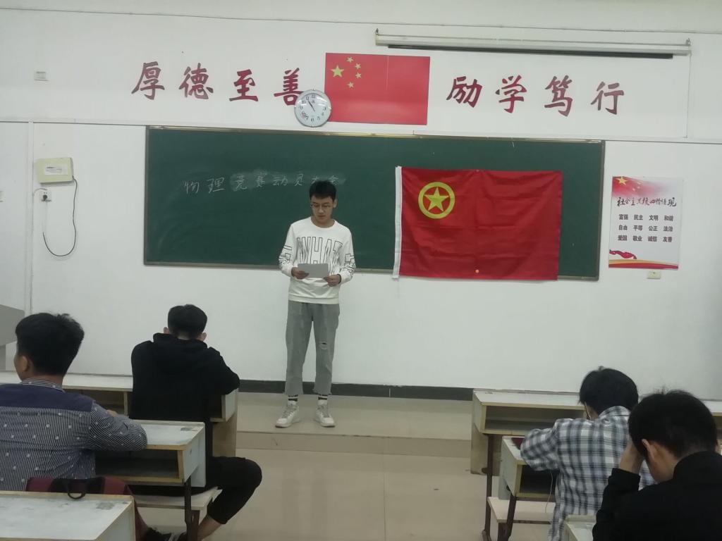 为迎接江西省第八届大学生物理创新大赛。2019年10月18日,18机设一班于英华楼3502教室举行了班级物理竞赛动员大会。18机设一班全体成员参与。