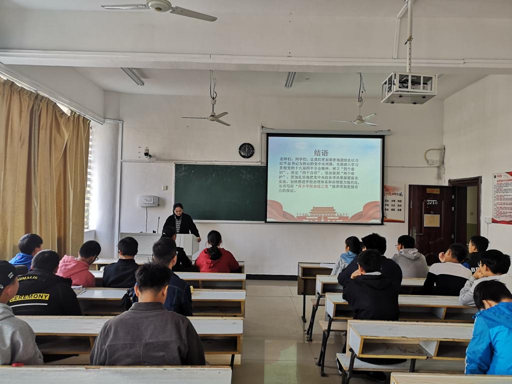 为进一步学习宣传贯彻党的十九届四中全会精神,帮助广大师生树牢“四个意识”,坚定“四个自信”,坚决做到“两个维护”,根据学校统一安排,12月16日中午,机电学院在2216教师开展专题培训会,为“宣讲团”成员宣讲党的十九届四中全会精神。本次宣讲会由辅导员杨芳老师主持,18、19级各班班长、学生会各部门部长到场参加。