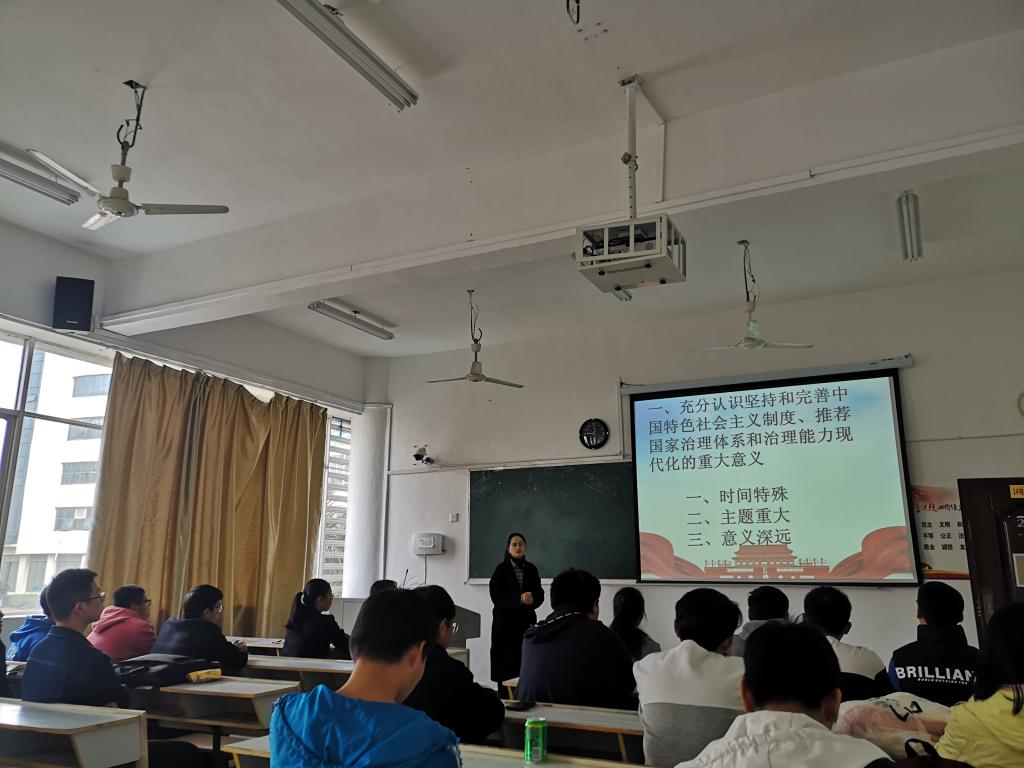 首先,杨芳老师带领着各位学生干部从认识坚持和完善中国特色社会主义制度的重要意义,到领会中国特色社会主义制度和国家治理体系的显著优势,再到把握中国特色社会主义制度,到最后的强化责任担当,切实抓好十九届四中全会精神贯彻落实,让同学们从对于十九届四中全会并不太了解到后面的对于十九届四中全会已经有了一个基本的认识,本次宣讲会最终在同学们的掌声中圆满结束。