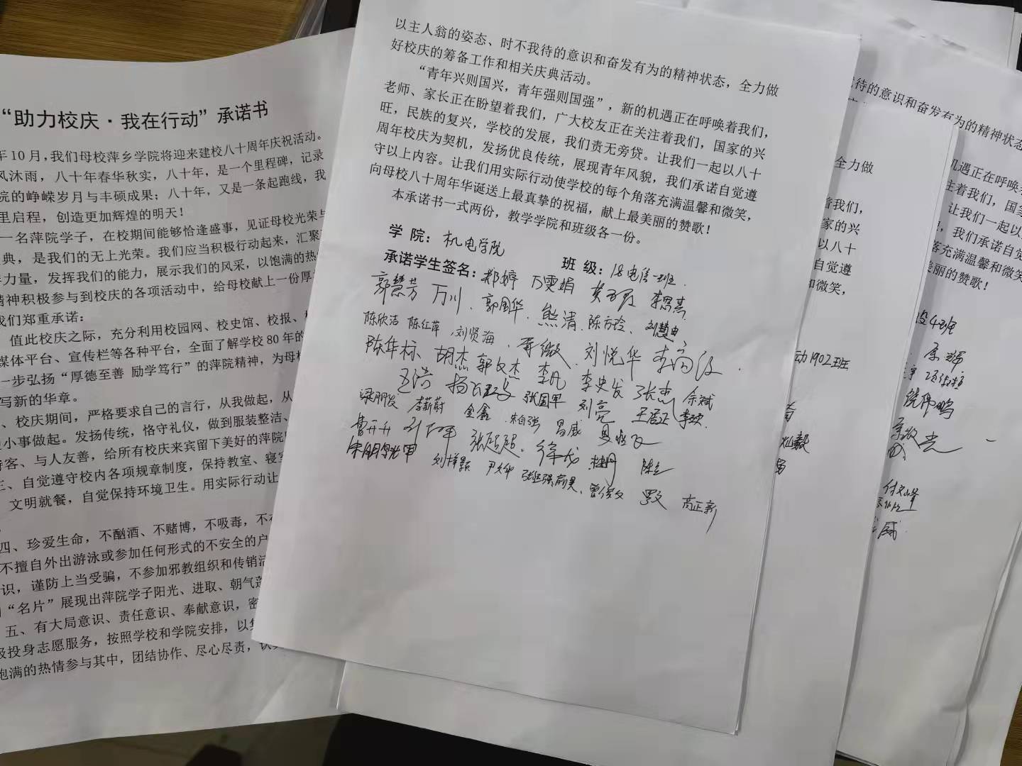 在交流讨论环节,同学们大胆说出自己的想法,校庆来临之际,我能做什么,我该怎么做。加强对教室和寝室的督察,服装整洁,注意自己的仪容仪表,言行要得体,要有大局意识,奉献意识,要全力积极投身志愿服务,用饱满的热情参与其中,团结协作,认真参与各项活动。同时,各班级分别组织全体同学签订助力校庆我在行动承诺书。